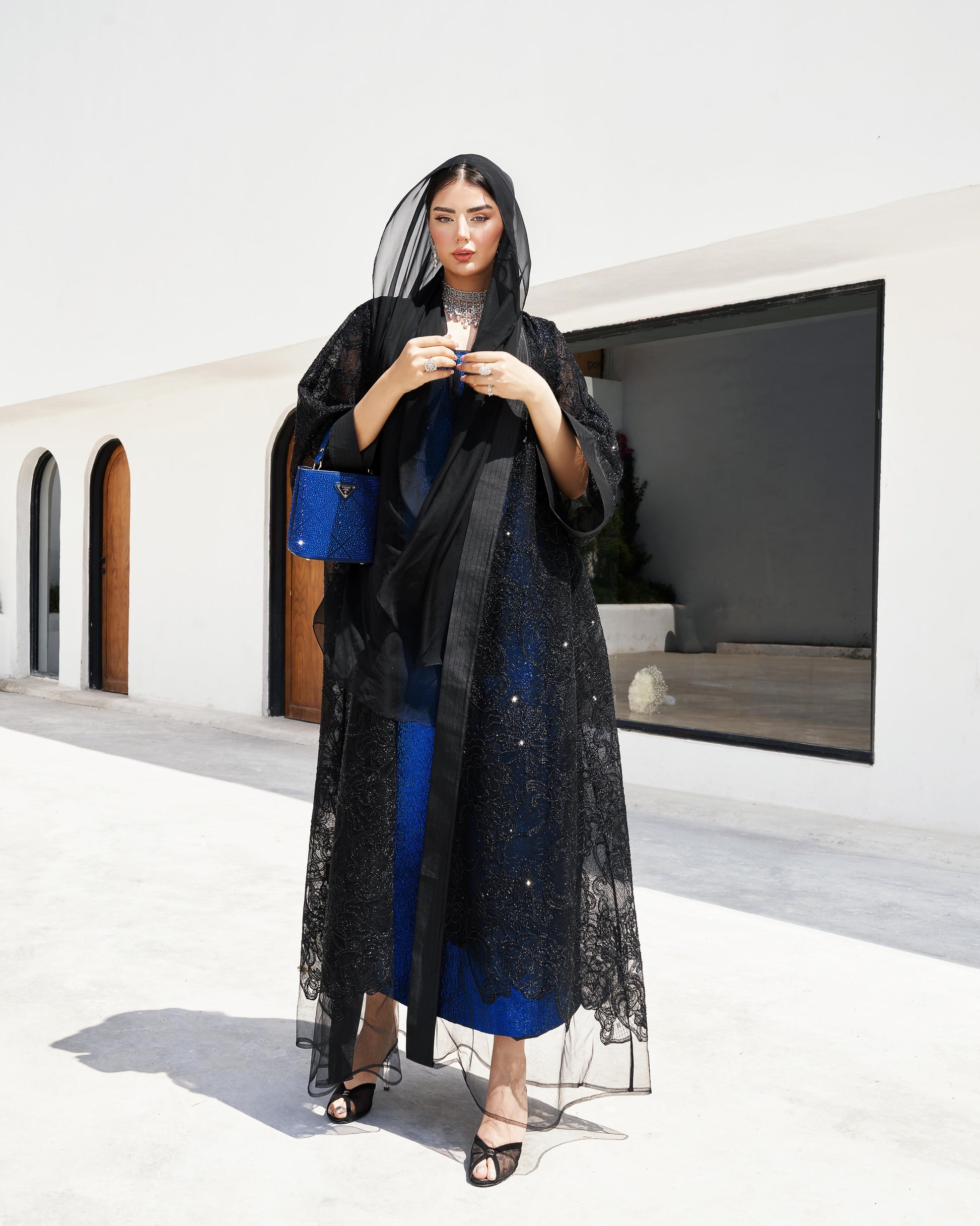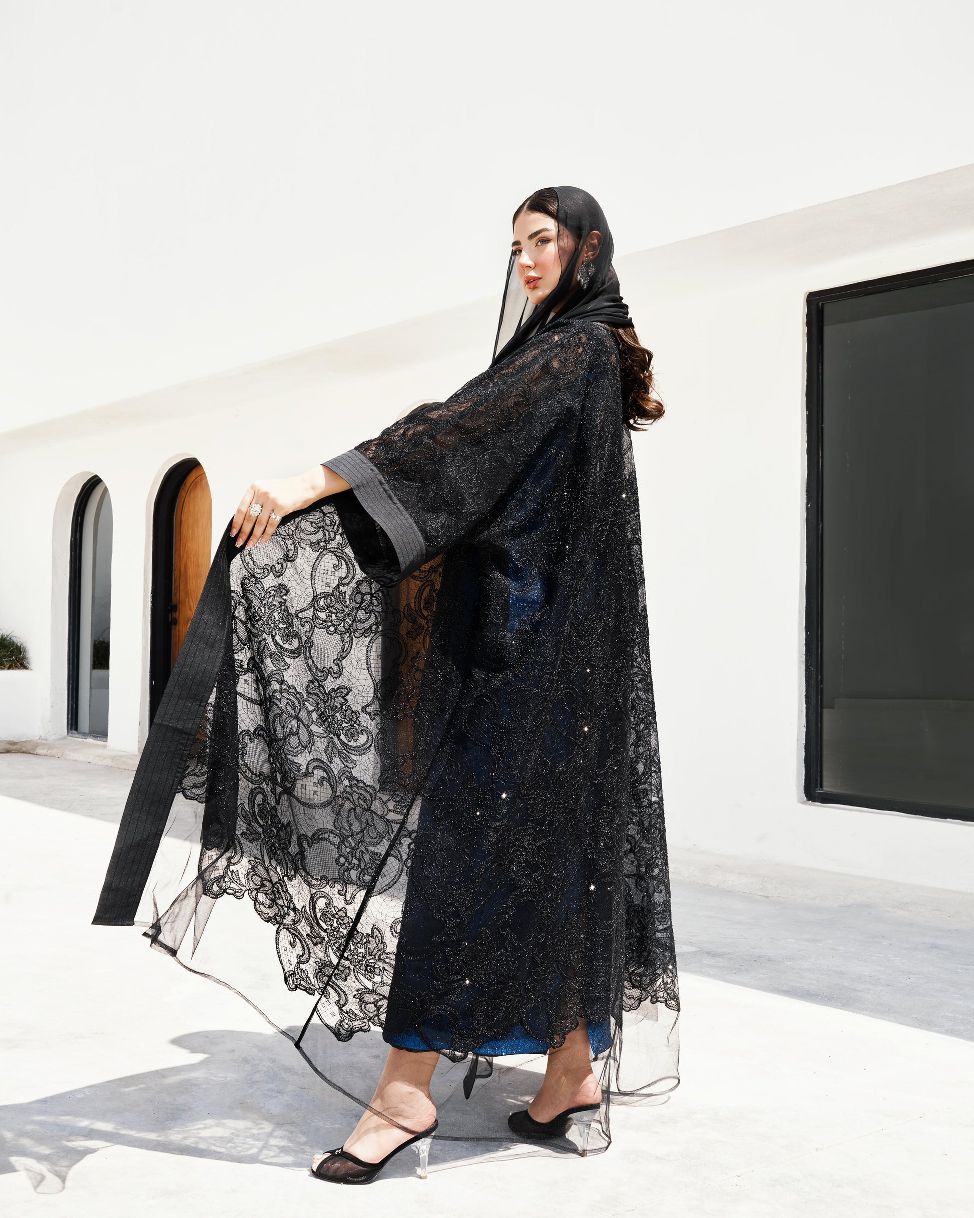 متشكلة من دانتيل و تور و كرستالات اسود قصة بشت وسيعه