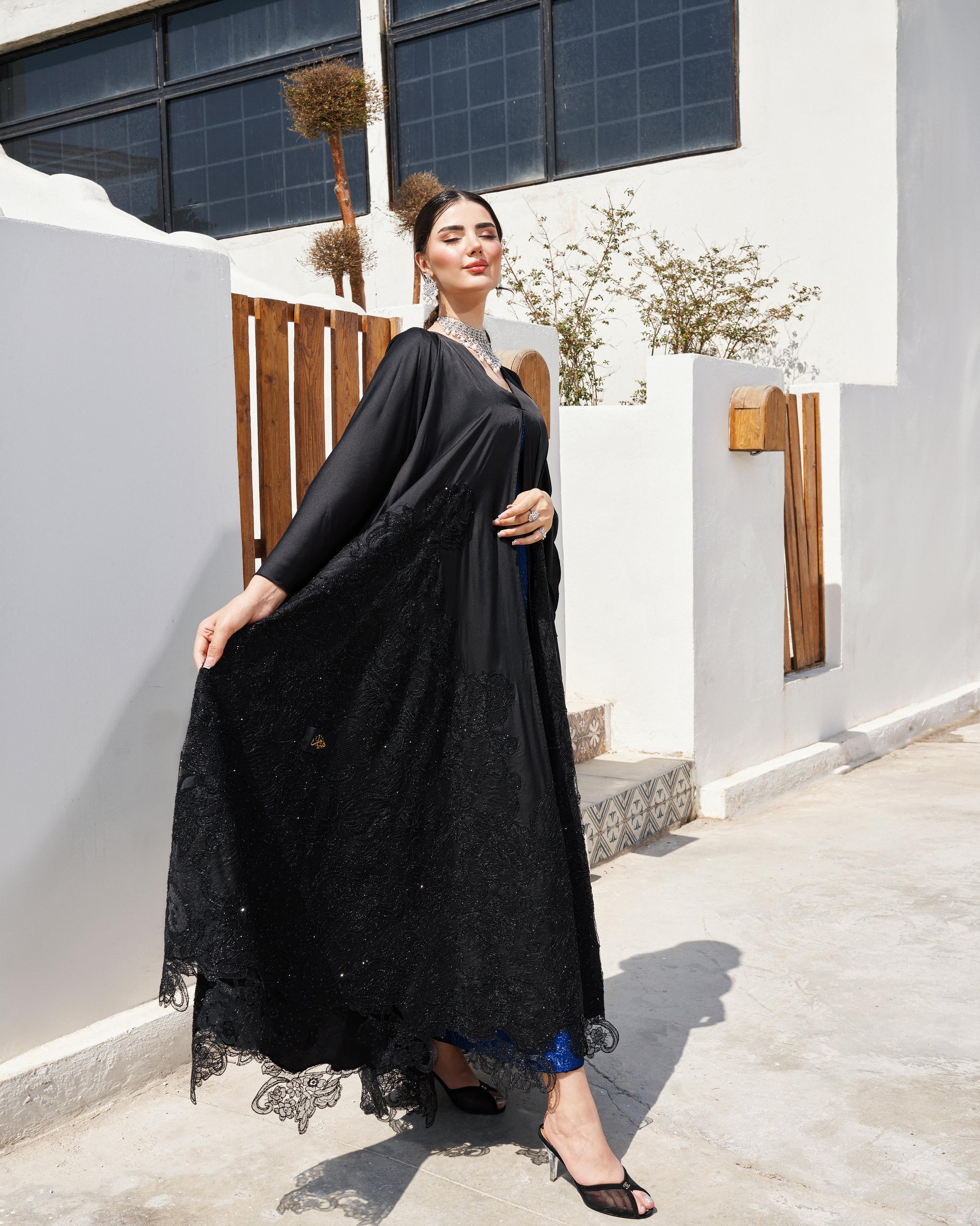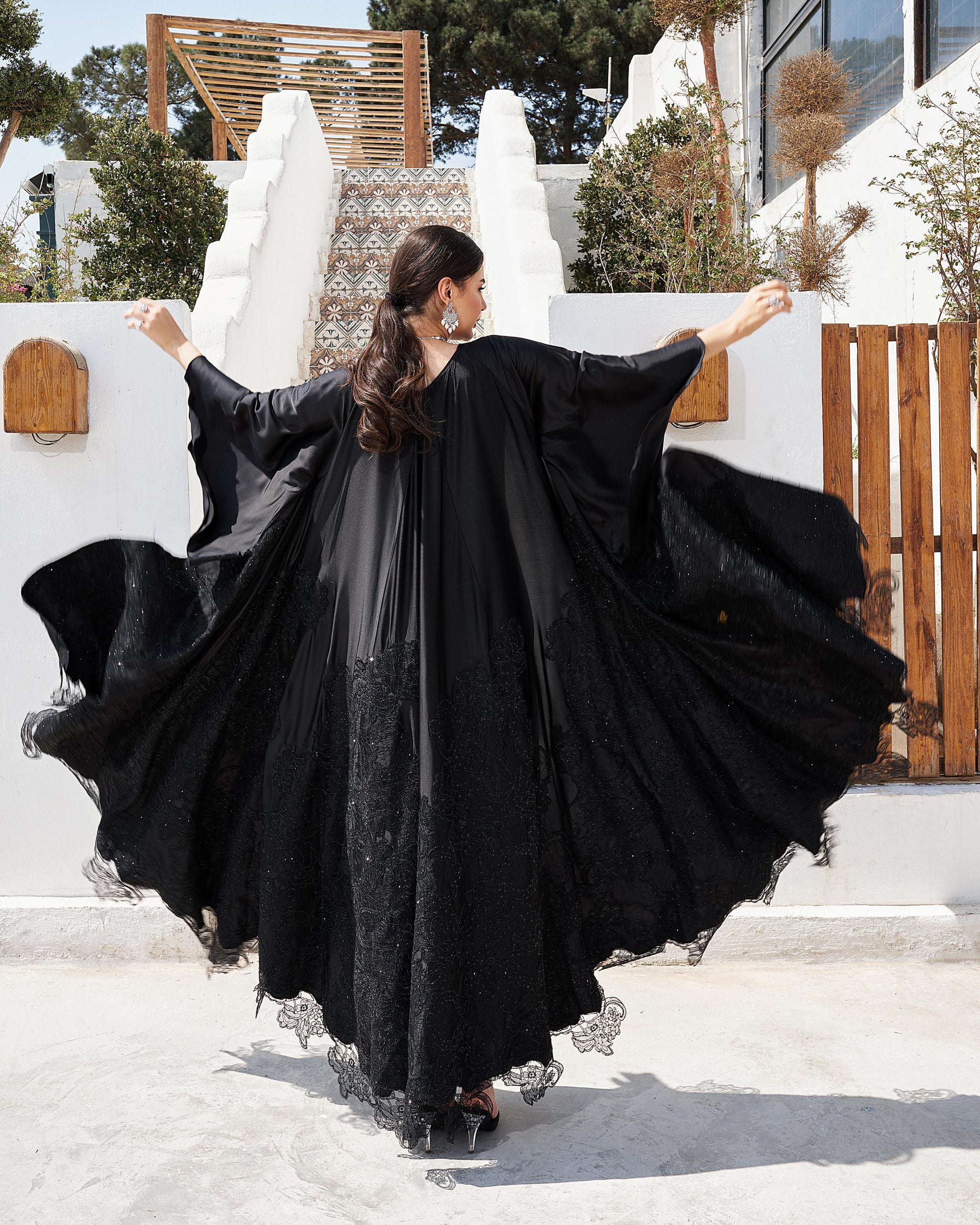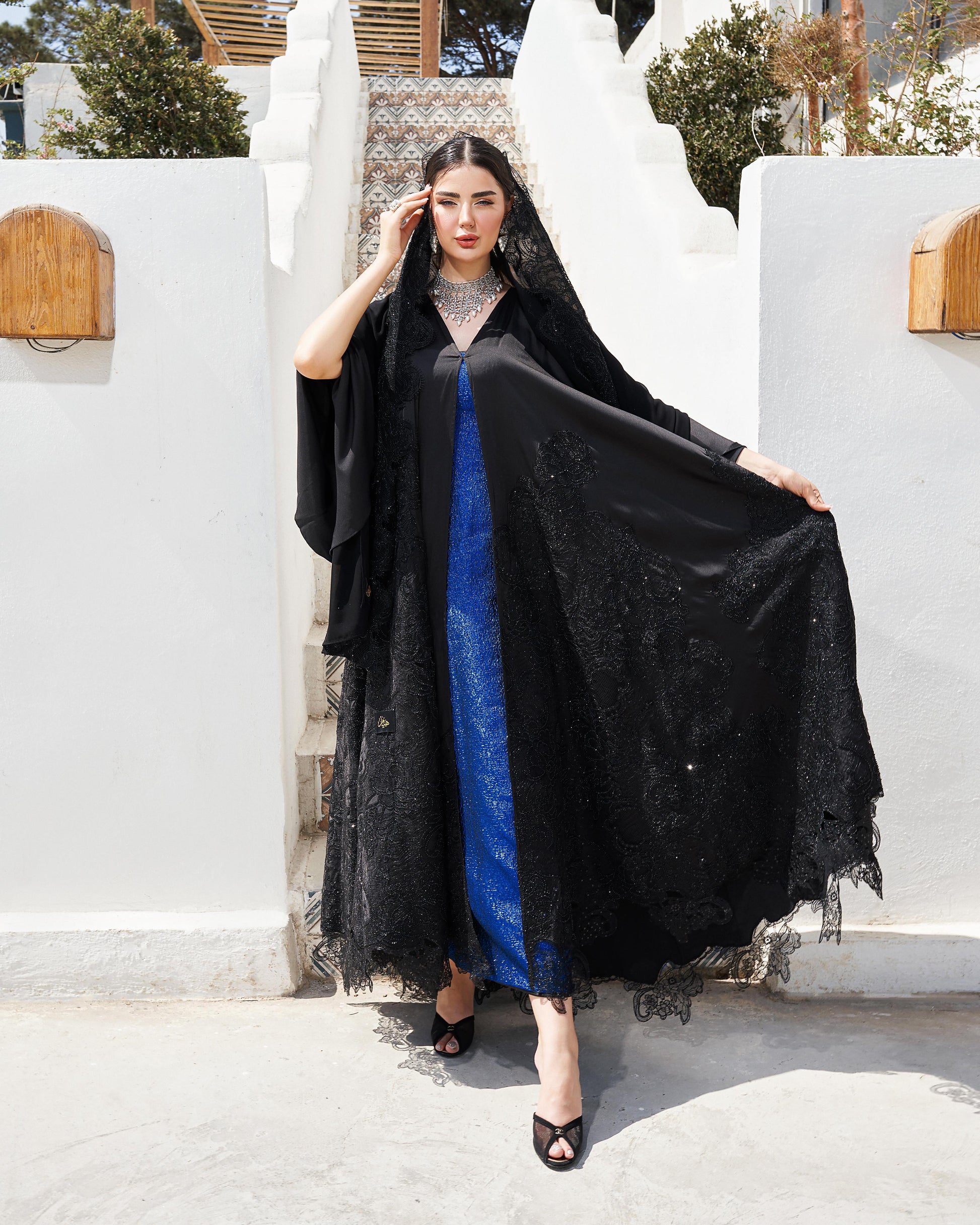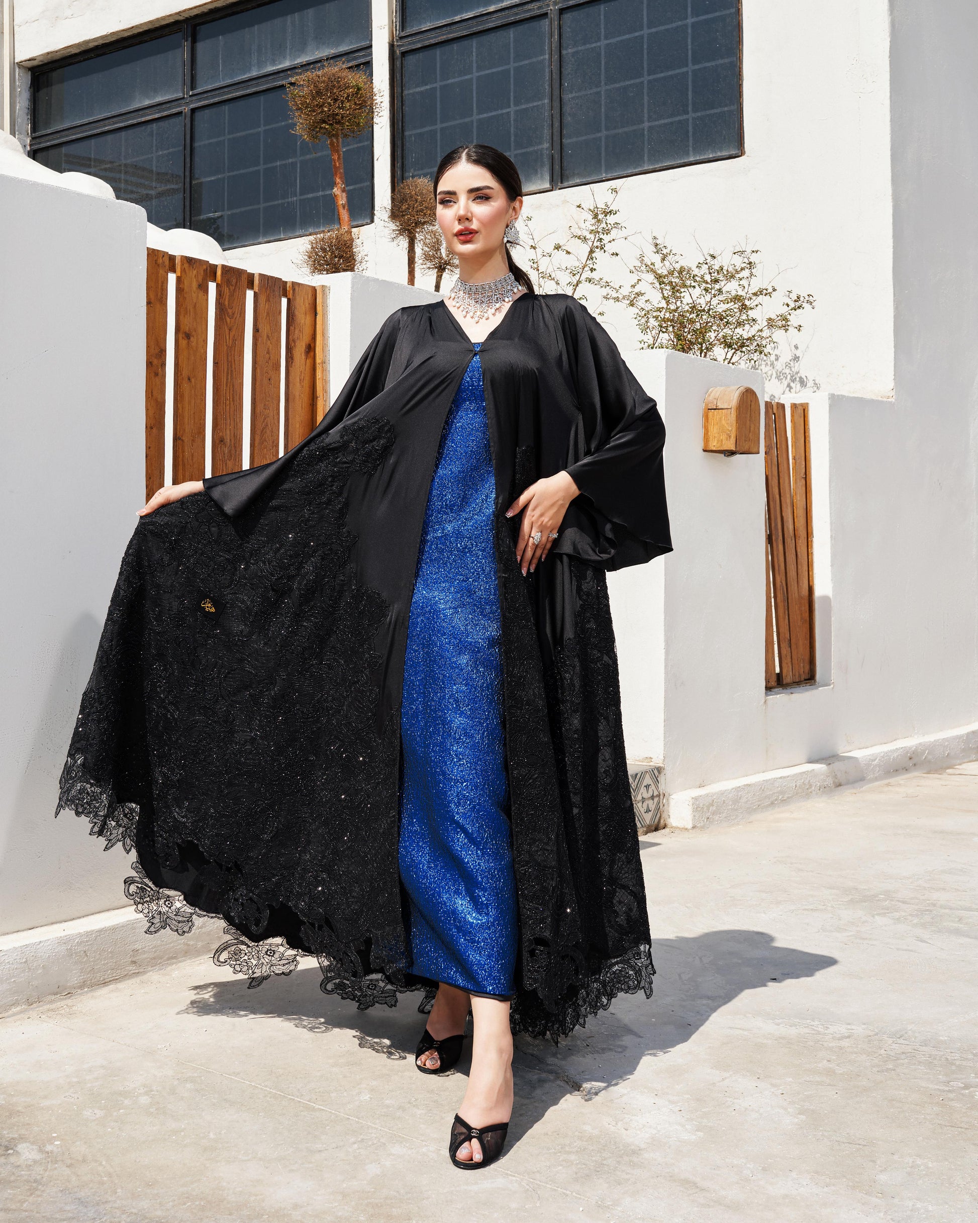 عباية حرير مع دانتيل و كريستال اسود ،قصة دبل كلوش