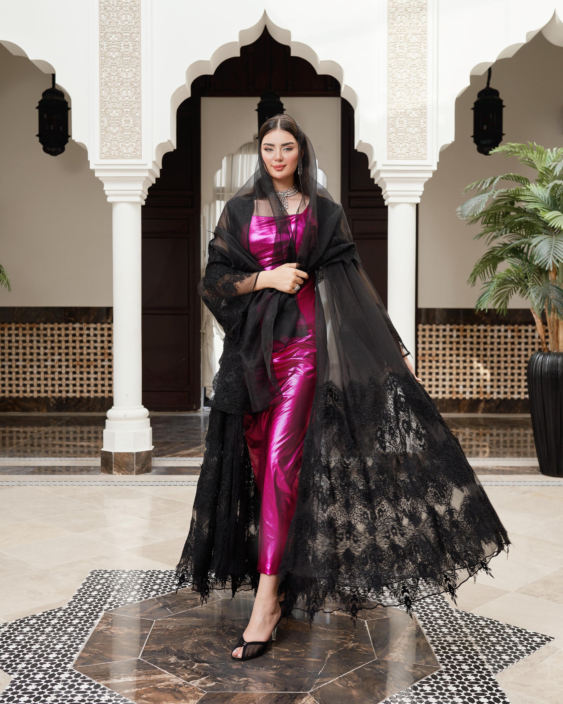 عباية اورغانزا دبل كلوش مع دانتيل و كرستال اسود
